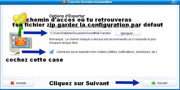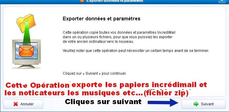 Une fenêtre apparait. Cette opération exporte les papiers incredimail, les notificateurs, les musiques etc... de votre incredimail sous forme de fichier zip.